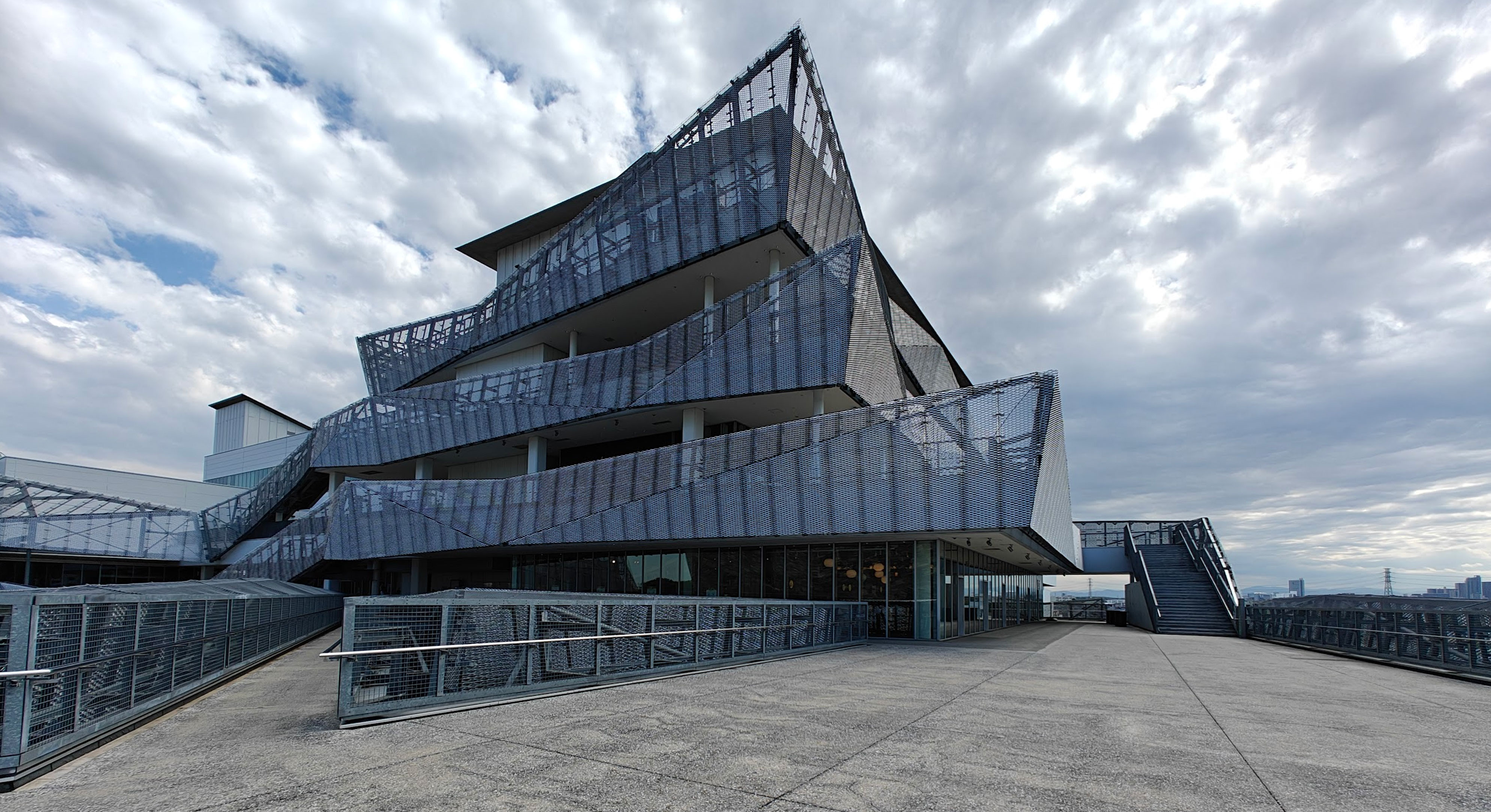 Open promenades, scenic waterfront parks, and broad pedestrian paths interlaced seamlessly with sleek buildings. The waterfront is lined with broad walking trails and green spaces where locals and tourists gather along Tokyo Bay. Fuji Television Building and its massive silver framework create a geometric lattice that seem to suspend the building’s elements in mid-air. The colossal steel grid has its each beam meticulously designed to support a sprawling stack of glass and metal cubes.